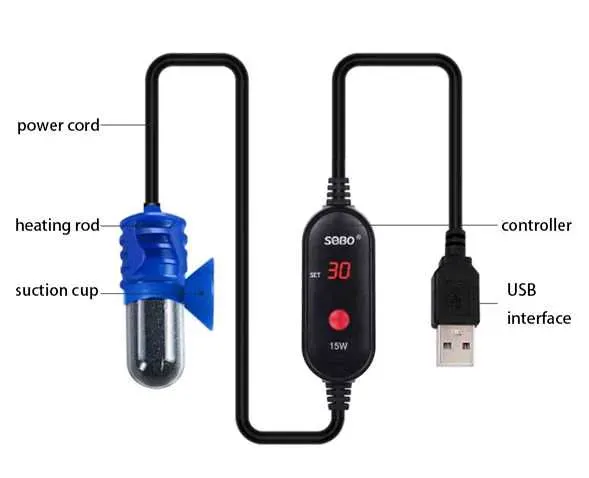 El calentador Sobo FM-10W es un mini termocalentador compacto diseñado específicamente para acuarios pequeños o peceras de hasta 5 litros, que funciona mediante conexión USB.