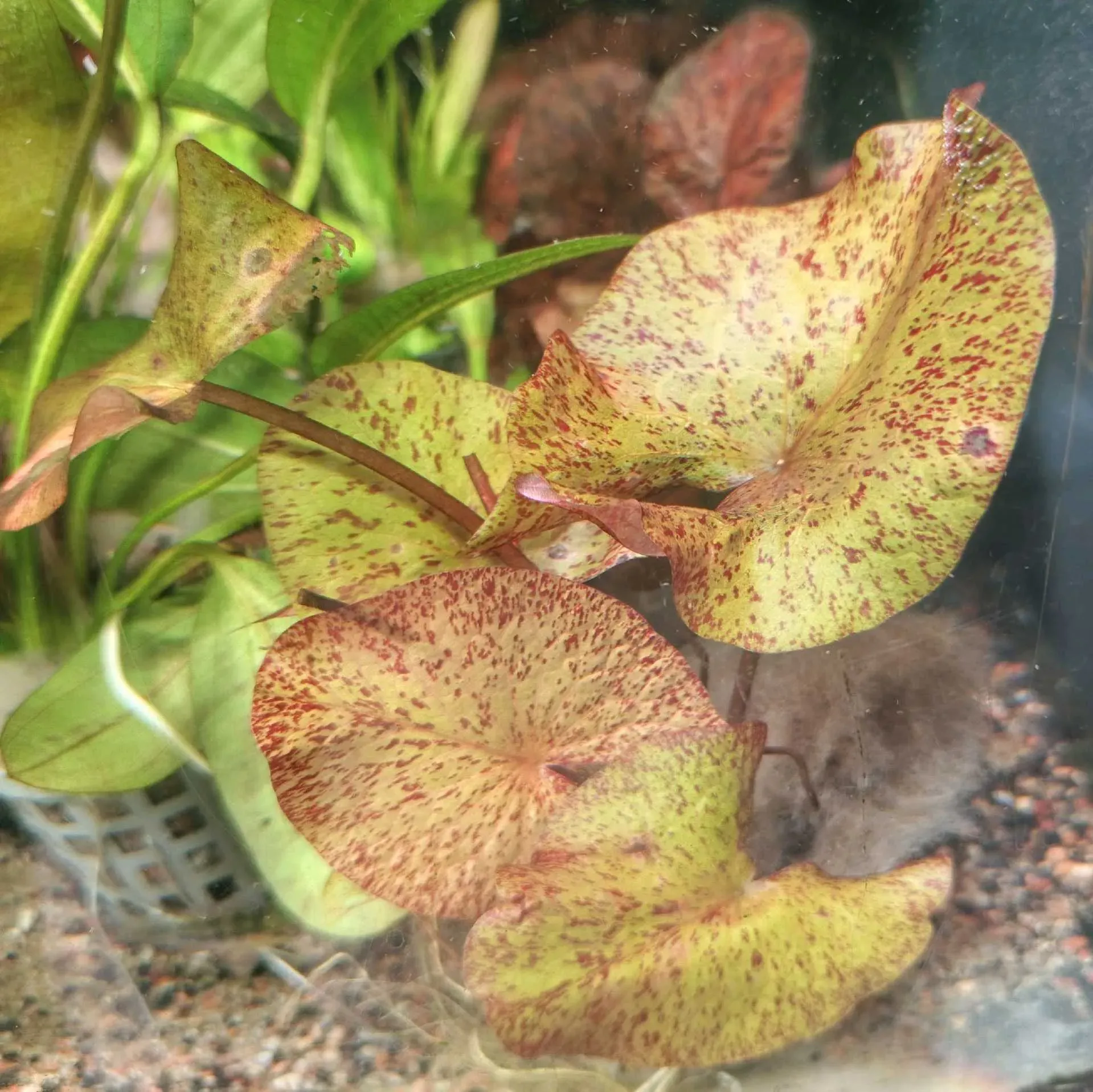 Es una planta acuática de bulbo popular en acuarismo por sus hojas moteadas que pueden variar en color desde el verde hasta tonos rojizos o morados.